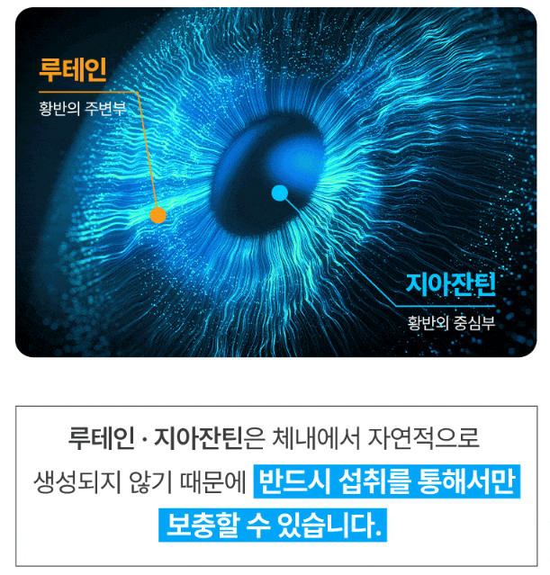 루테인과 지아잔틴은 눈의 망막을 보호하고 블루라이트로 인한 눈의 피로와 황반 변성을 예방하는 데 도움을 줍니다.