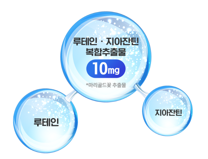 특히, 루테인 지아잔틴 복합추출물은 1포당 10mg으로 성인 기준 하루 권장섭취량의 100%를 충족합니다.