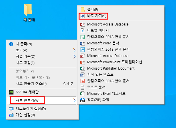 2. '새로 만들기' → '바로가기'를 선택합니다.