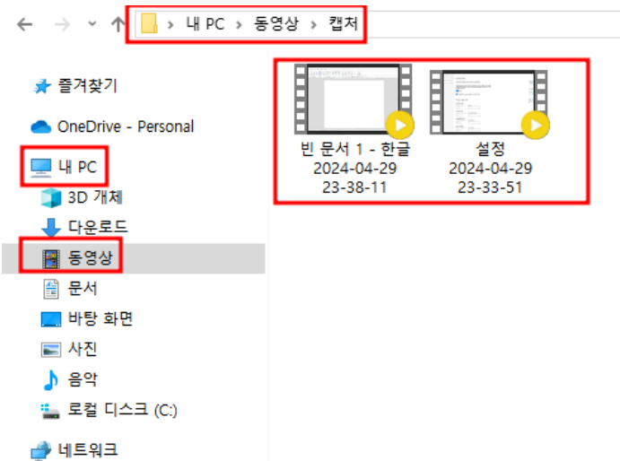 화면 녹화가 성공적으로 완료되면 녹화된 파일은 '내PC > 동영상 > 캡쳐' 폴더에 자동으로 저장됩니다. 이 위치는 사용자의 선호에 따라 설정 메뉴를 통해 변경할 수 있습니다.