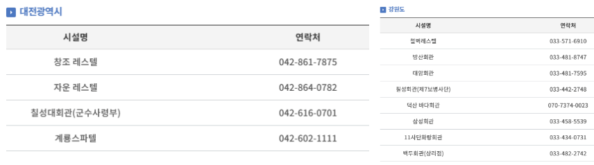 각 지역에 위치한 숙소 조회와 문의번호는 육군휴드림 홈페이지에서 확인할 수 있습니다.