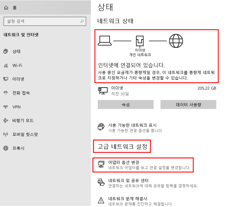 잘못된 어댑터 설정이 문제를 일으킬 수 있으므로 이 부분도 점검해 보세요. 고급 네트워크 설정에서 어댑터 옵션 변경으 로 들어갑니다.