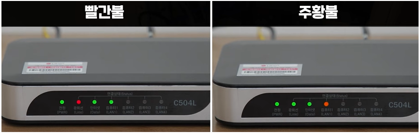 먼저, 가장 문제가 많이 발생하는 장치는 외부에서 디지털 신호를 끌어오는 모뎀입니다. 모뎀의 LED 상태를 체크해 보세요.