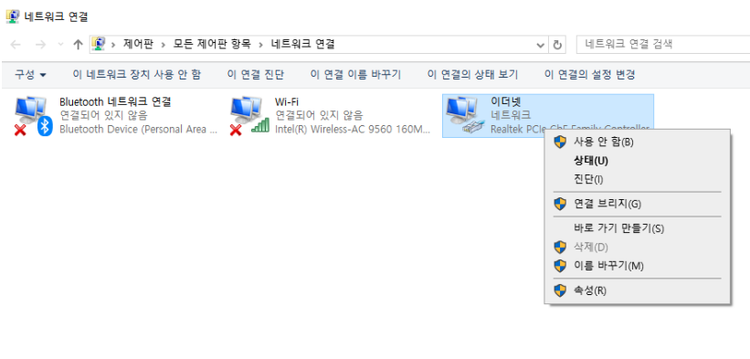 이더넷이 뜰텐데 이더넷 우클릭하고 사용 안함을 '다시 사용'으로 변경하여 네트워크 초기화 해주시면 됩니다. 이 과정은 컴퓨터의 네트워크 설정을 기본 값으로 복원하며 대부분의 문제를 해결할 수 있습니다.