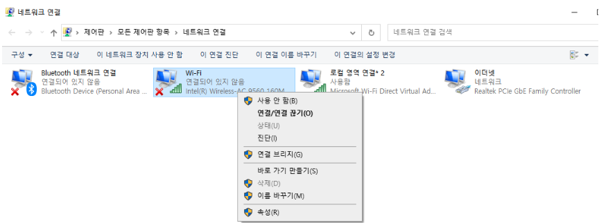 이는 노트북의 경우가 많은데요. 아까 화ㅁ면에서 와이파이 쪽 마우스 우클릭하여 속성에 들어갑니다.