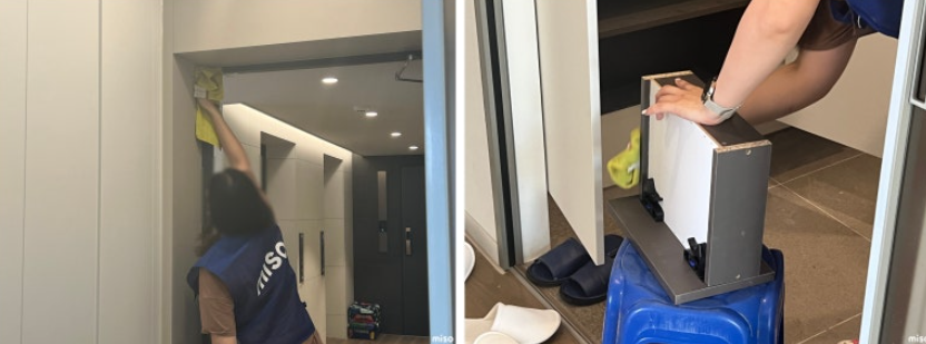 그 다음 주방과 욕실 같은 위생이 중요한 공간을 집중적으로 관리하며, 마지막으로 바닥 청소와 필요한 경우 왁스 작업까지 진행하여 마무리합니다.