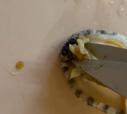 전복의 앞부분에는 이빨과 식도가 있습니다. 이 부분은 가위로 조심스럽게 잘라내야 하는데, 입 부분이 약간 불룩한 것을 확인할 수 있습니다. 가위로 살짝 절개한 후 손으로 잡아당기면 하얀 이빨과 빨간 식도가 함께 제거됩니다.