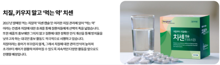 치센은 동국제약에서 개발한 먹는 치질약으로 주성분은 디오스민입니다. 치센은 방치되기 쉬운 질환의 효과적인 관리를 돕기 위해 출시됬는데 '먹는 약'으로 관리가 더 쉬워졌습니다.