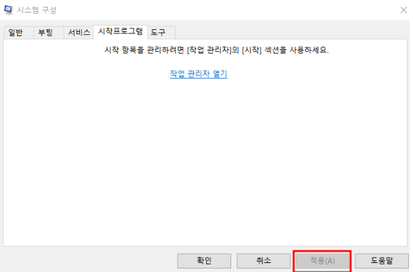 변경조치를 마쳤다면 작업관리자 창을 닫고 방금 전의 시스템구성에서 [적용] 후 윈도우 재부팅을 하면됩니다.
