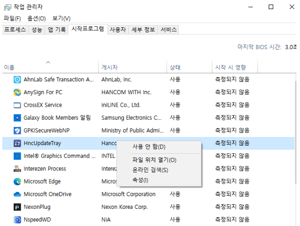작업관리자 창에서 여러 파일들이 뜰텐데 여기서 사용하지 않는 항목들은 마우스 우클릭하여 [사용안함] 으로 변경해줍니다.