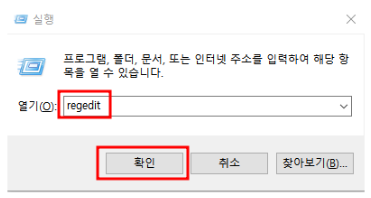 먼저, [윈도우]+[R]을 눌러 실행창을 열어주고 실행창에 regedit 입력 후 확인을 눌러줍니다.