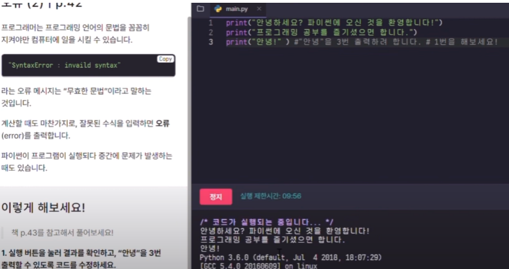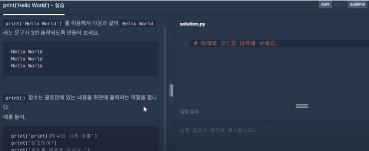 다른 플랫폼과 비슷하게 실습내용과 실습 가이드가 있고 옆에 코디실습기에서 코드를 입력하면서 실습할 수 있는 형태로 되어 있습니다.