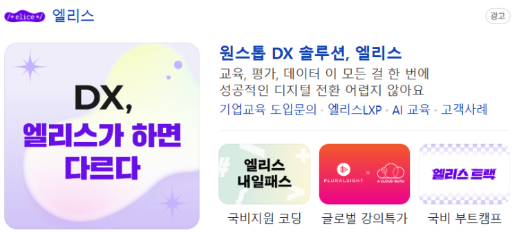 첫 번째 사이트는 요즘 선릉역 5번출구에서 아주 대문짝 만하게 광고가 붙어 있는 엘리스입니다. 정확히 교육 사이트는 엘리스 아카데미라고 검색해야지 나옵니다.