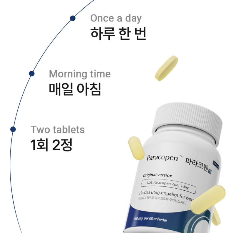 파라코펜의 권장 복용법은 하루 2회, 1회당 1정입니다. 특별한 시간 제한이 없어 자유롭게 복용할 수 있으며, 식사 시간과 관계없이 섭취가 가능합니다.