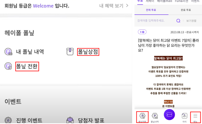 '더보기>헤이폴 폴닢>폴닢 전환' 순으로 진행하시고 본인인증만 하면 바로 수수료 없이 포인트 전환비율 1:1로 제휴사 포인트 전환이 가능합니다.