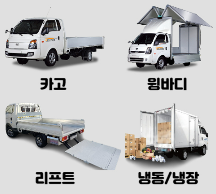 1톤 차량에는 여러 종류가 있습니다. 카고(무천장 차량), 탑차(천장이 있는 차량), 리프트차(리프트가 설치된 차량), 냉동탑차(냉장 및 냉동 기능이 있는 차량) 등이 있습니다.